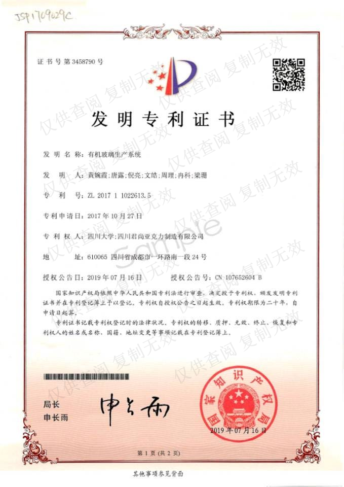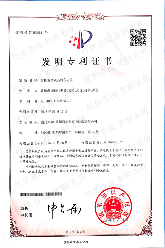 高效节能 VO 2 热色玻璃(又叫纳米 VO 2 改性有机玻璃),它是在甲基丙烯酸甲酯(MMA)中添加具有智能隔热功效的纳米 VO 2 浆料后通过高温和低温聚合反应得到的隔热有机玻璃系列产品。其产品是通过夏天防止太阳光中的近红外光穿过玻璃进入室内,冬天则使太阳光中的近红外光透过玻璃进入室内,来到达冬暖夏凉智能控温的效果。相关研究表明,门窗玻璃的热损失是建筑能耗的主要部分,占建筑能耗的 45%以上,这就意味着我们要改变玻璃的性能来减少热能的损失。本产品与传统的透明有机玻璃相比,具有优异的智能隔热效果。且产品是按不同隔热效果和不同厚度来进行分类的,简称 V-1、V-2、V-3、V-4、V-5、V-10 高效节能VO 2 热色玻璃。其透过率越低,颜色越深,隔热效果越好;反之,透过率越高,颜色越浅,隔热效果越差,且不同厚度应用也不同。V-1 一般用于建筑门窗的中间层;V-2 多用于汽车、飞机、高铁、地铁等门窗上;V-3 则常用于机场玻璃落地窗、室内泳池天窗或落地窗;V-4 常用于可塑型的展览馆;V-5 多用于高档商场落地窗;V-10 则常用于阳光养殖房等领域。